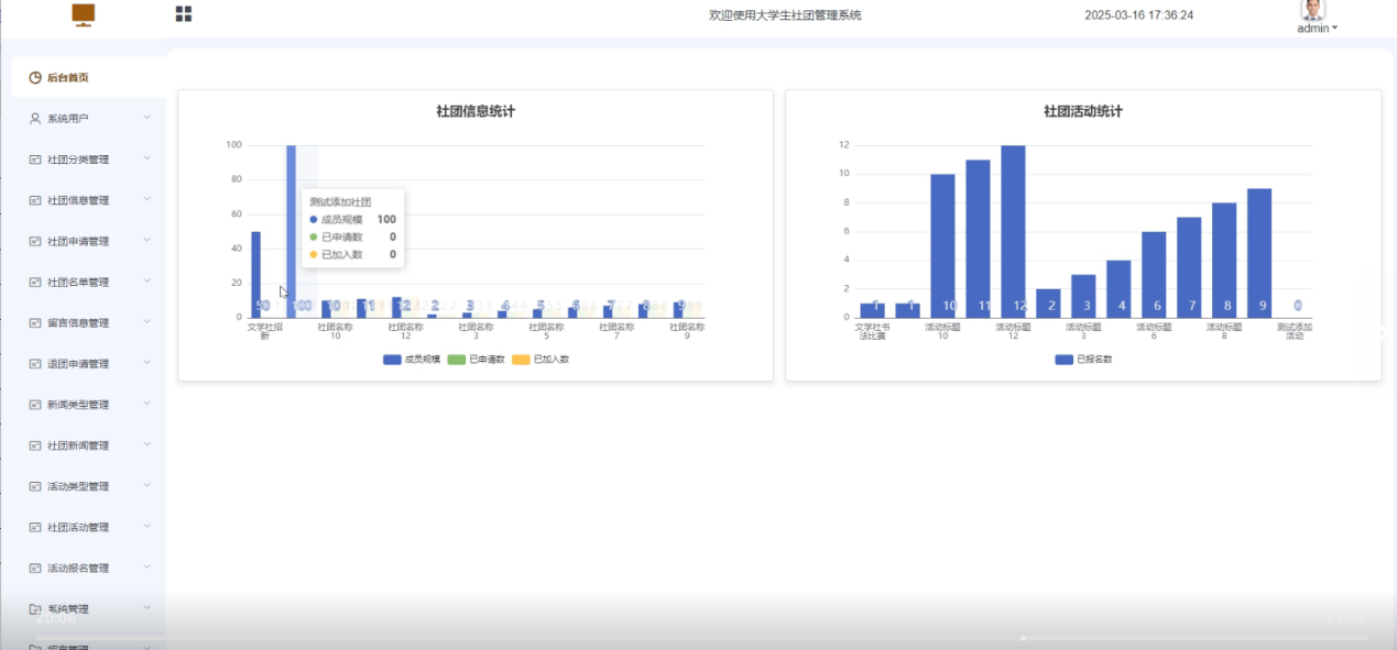 管理员可以直观地查看各类数据统计,如社团成员增长趋势、活动参与度、不同类型社团的分布情况等,从而快速掌握系统运行的整体状况,并基于数据分析做出更为精准的管理决策。这一设计使得管理员能够高效维护和优化整个大学生社团管理系统。后台首页界面如图5-11所示。