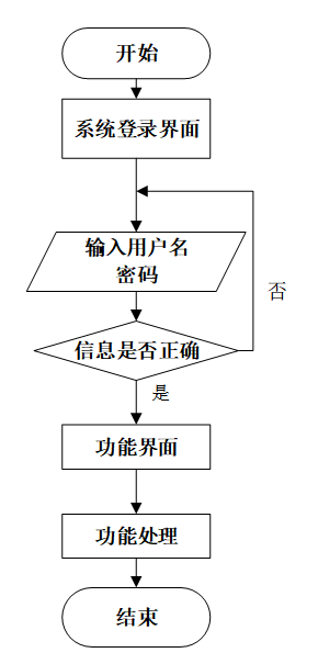 用户首先进入系统登录界面,输入用户名和密码后,系统验证信息是否正确。若验证失败,返回登录界面重新输入;若验证成功,则进入功能界面,执行相应功能处理后结束操作流程。操作流程如图3-6所示。