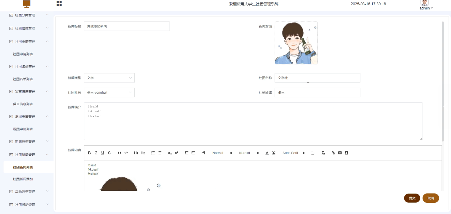 社团新闻管理功能让管理员发布、编辑和删除社团相关的新闻资讯,确保社团活动和成就得到及时有效的传播。社团新闻管理界面如图5-14所示。