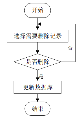用户选择需要删除的记录后,系统判断是否确认删除。若未确认,返回选择环节;若确认删除,则更新数据库,删除对应记录,完成操作后流程结束。删除信息流程图如图3-9所示。
