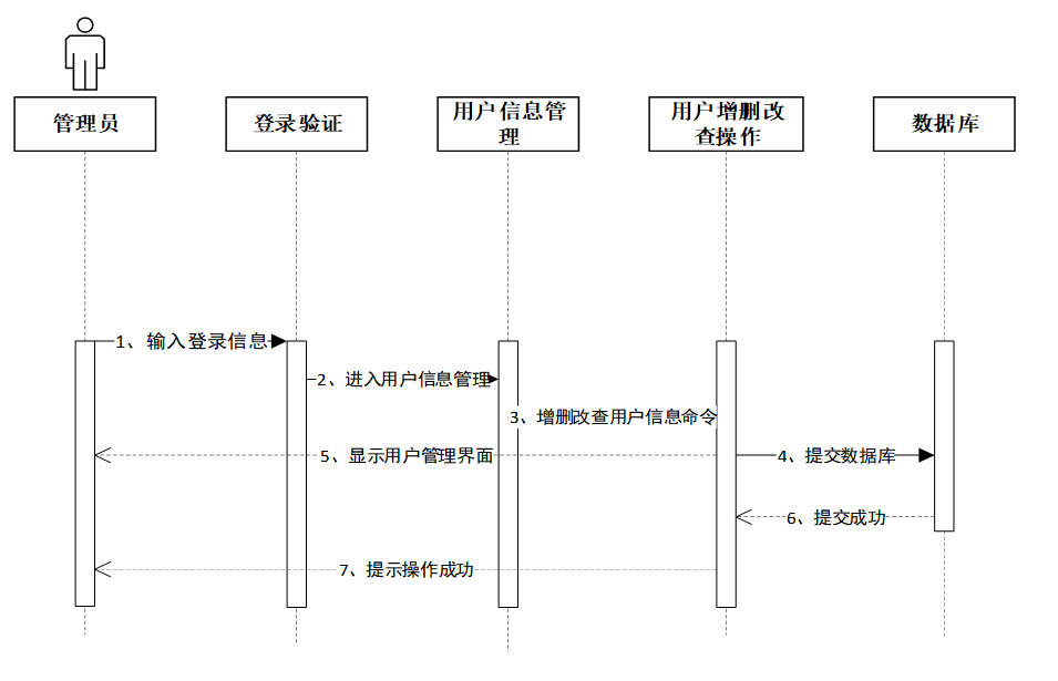 管理员输入登录信息后,进入用户信息管理模块,选择增删改查操作并提交命令至数据库。数据库执行操作后返回成功状态,系统显示用户管理界面并提示操作成功。管理员修改用户信息时序图如图4-5所示。