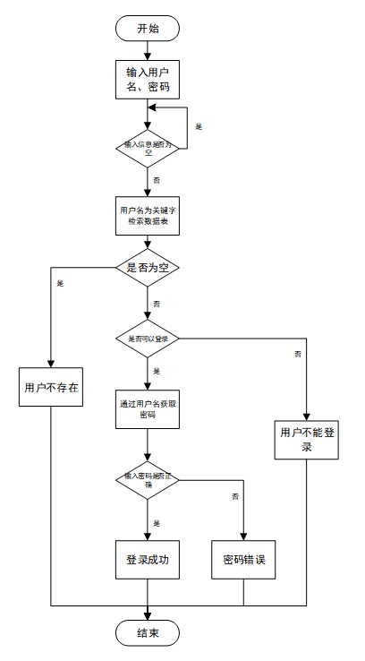 用户输入用户名和密码后,系统先检查输入是否为空,再验证用户名是否存在,若存在则通过用户名获取密码并校验。若密码正确则登录成功,否则提示密码错误。若用户名不存在或无法登录,提示用户操作无效。如图3-5所示。