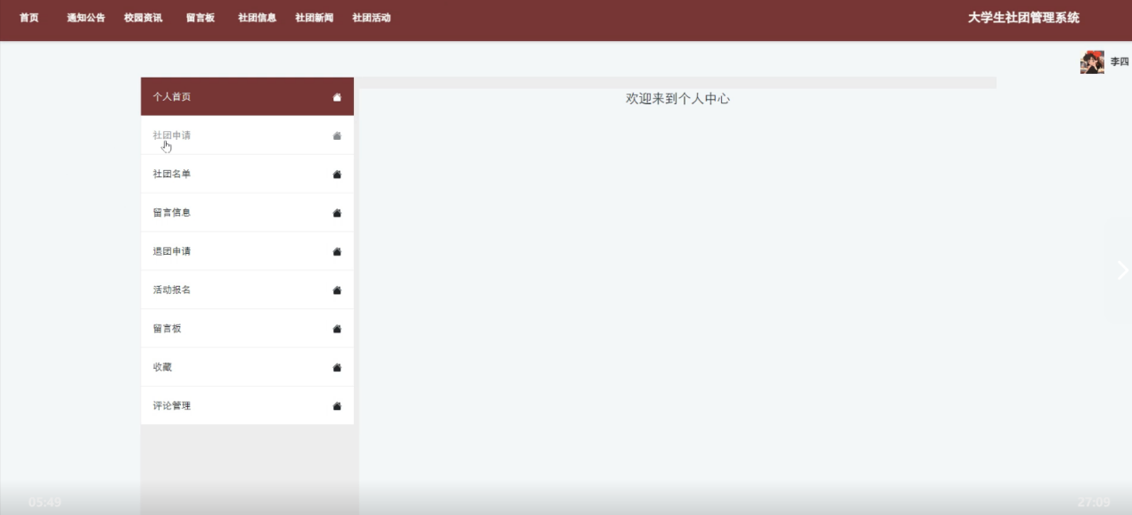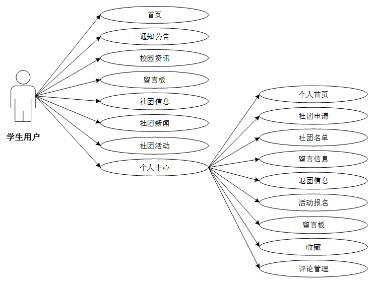 学生用户可查看首页、通知公告、校园资讯、留言板、社团信息、社团新闻、社团活动、个人中心(个人首页、社团申请、社团名单、留言信息、退团信息、活动报名、留言板、收藏、评论管理)等功能。