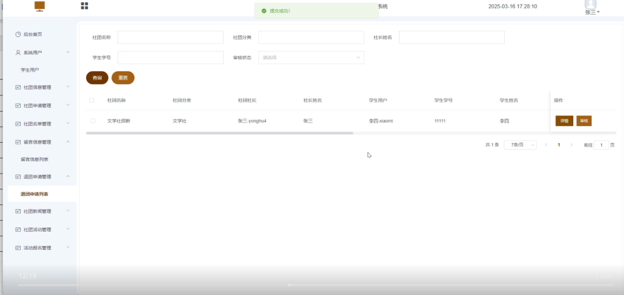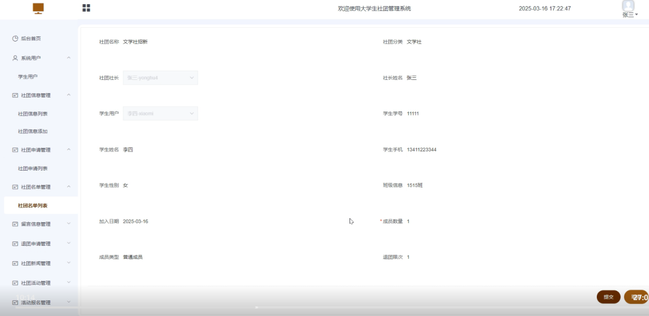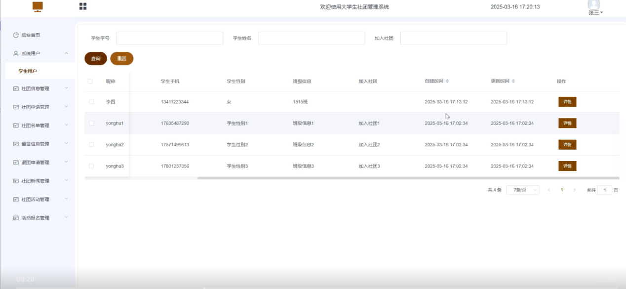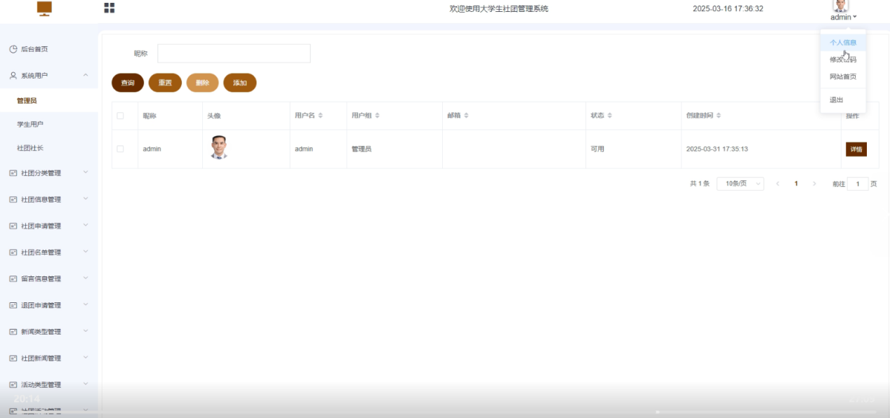 管理员能够管理所有类型的系统用户,包括添加、删除和编辑管理员、学生用户及社团社长的信息,确保用户数据的准确性和安全性。系统用户界面如图5-12所示。