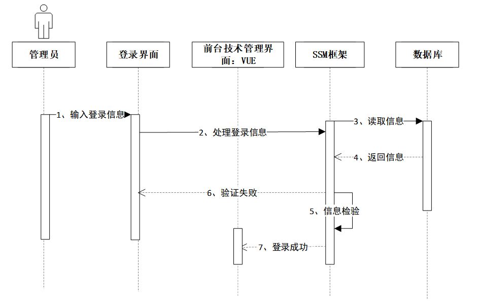 管理员输入登录信息后,登录界面将信息传递至前台管理界面,随后通过SSM框架读取数据库中的用户信息并返回。系统验证信息,若验证成功则登录成功,若验证失败则返回错误提示。登录时序图如图4-4所示。