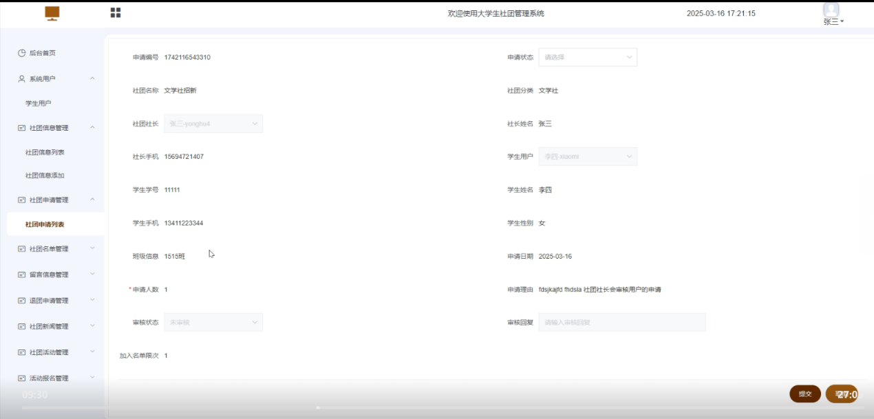 社团社长可管理后台首页、系统用户、社团信息、社团申请、社团名单、留言信息、退团申请、社团新闻、社团活动、活动报名。