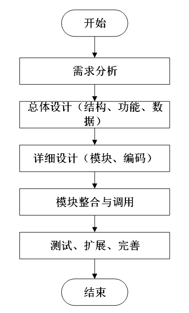 系统开发流程的主要步骤,从需求分析到系统完成的全过程。流程包括需求分析、总体设计(结构、功能、数据)、详细设计(模块、编码)、模块整合与调用,以及测试、扩展和完善,最终完成系统的开发。本系统的开发流程如图3-4所示