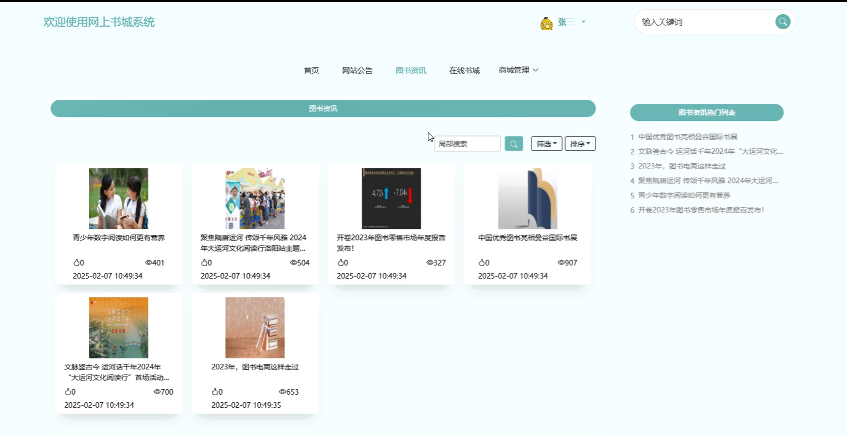 首页:展示热门商品、图书资讯及最新公告信息,帮助用户快速了解平台动态。支持搜索和筛选功能,提升用户体验。