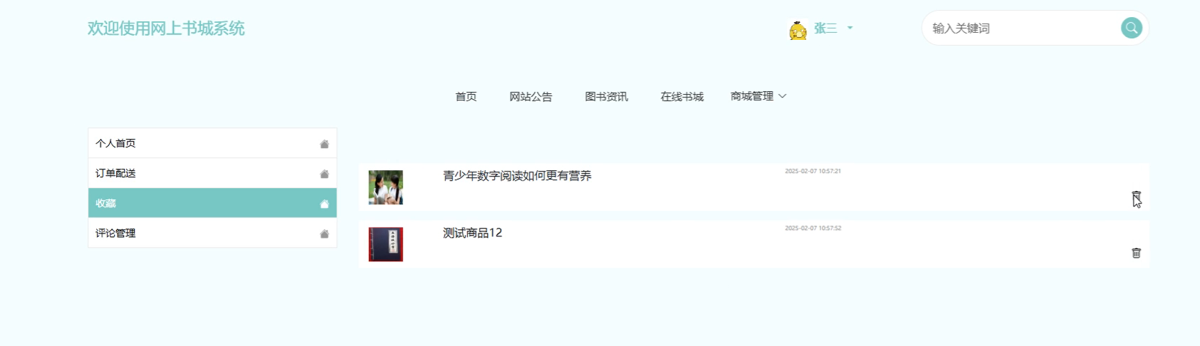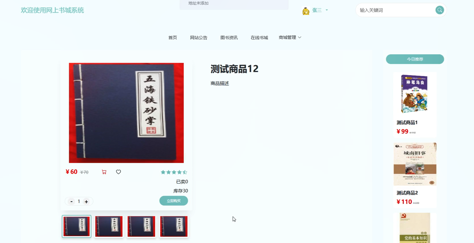 在线书城:浏览商品列表并查看详情,支持按类型、价格等条件筛选。可进行购买、点赞、收藏和评论操作。