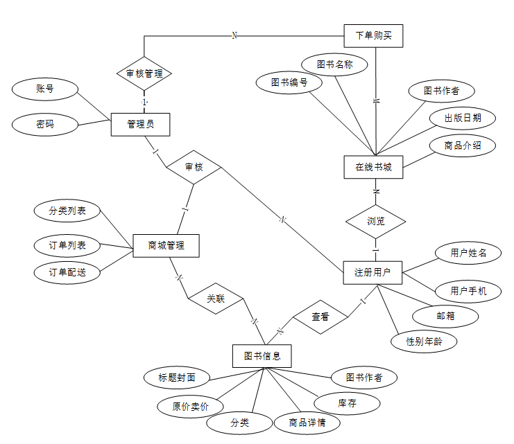 本文在系统分析阶段就抽取了一些实体,根据实体之间的关系,经过分析进行系统E-R图的设计。基于java的网上书城系统的总体E-R图如下图所示。