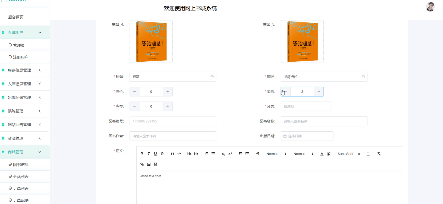 商城管理:管理员可以管理图书信息、分类列表、订单列表、订单状态查询等信息,可以进行增删改查等操作。