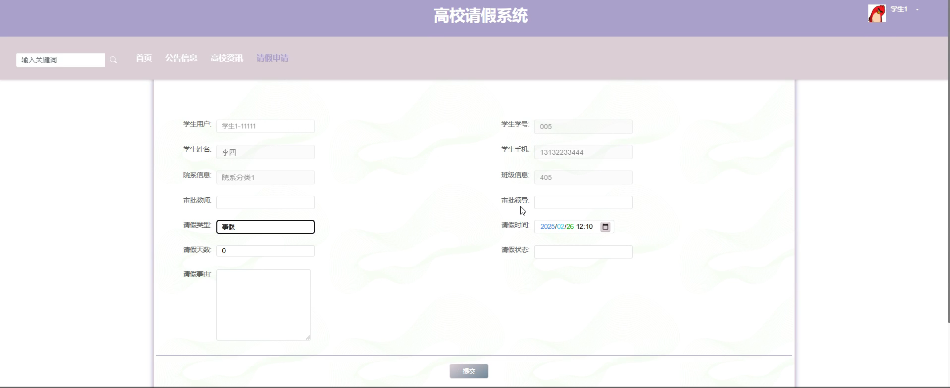 - 请假申请:请假申请功能允许学生在线提交请假请求;