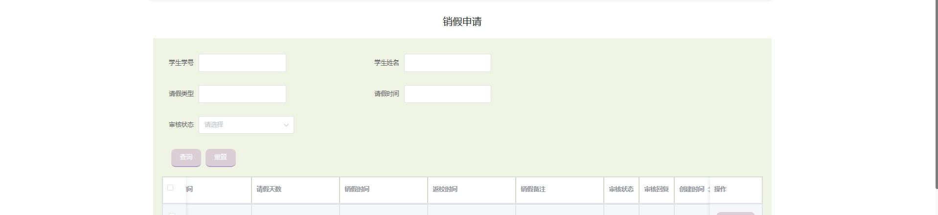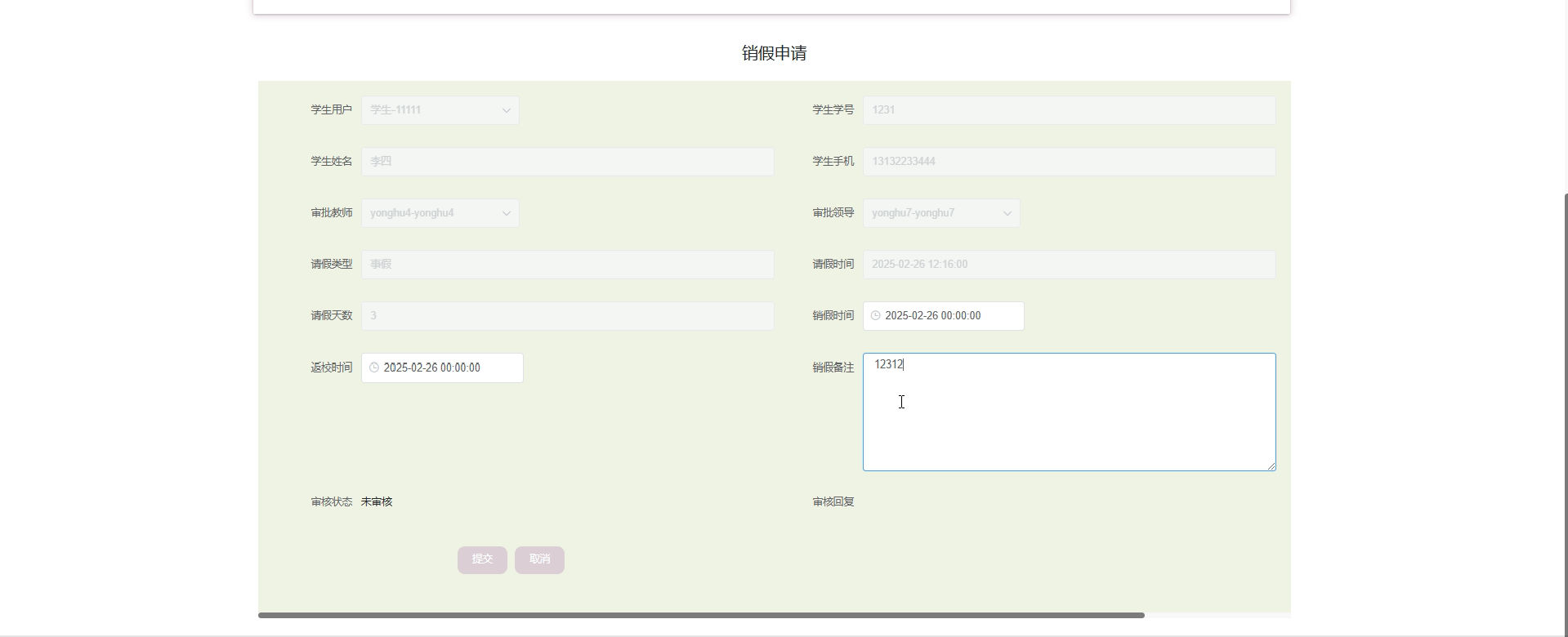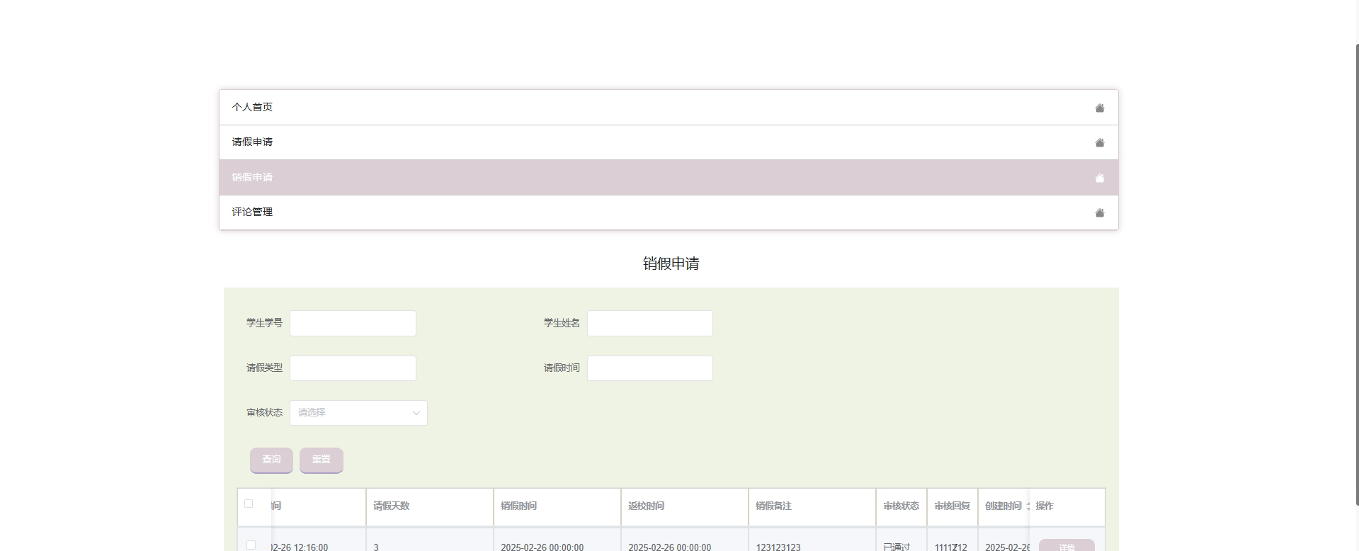 教师用户可以通过点击销假申请审核功能查看学生的返校情况和销假请求。在审核界面,教师能够详细检查学生的请假记录及返校信息,确保所有数据准确无误。根据学生提供的返校证明和其他相关信息,教师可以批准或拒绝销假申请。销假申请页面如图5-7所示。
