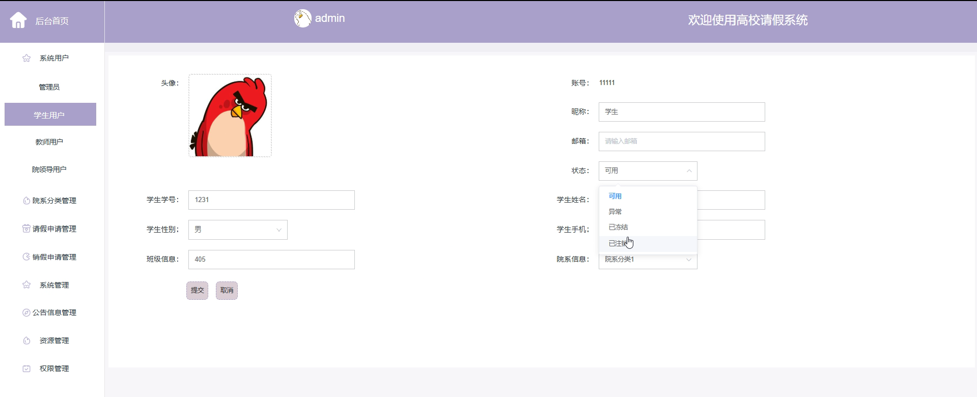 - 请假申请管理与销假申请管理:管理员能够全面监控并处理学生的请假和销假请求,保证请假流程的顺利进行;