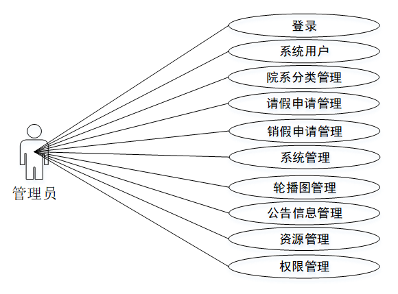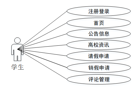 基于Spring Boot的高校请假系统用例分析主要从学生用户、教师用户、院领导用户、管理员这些实体展开描述。