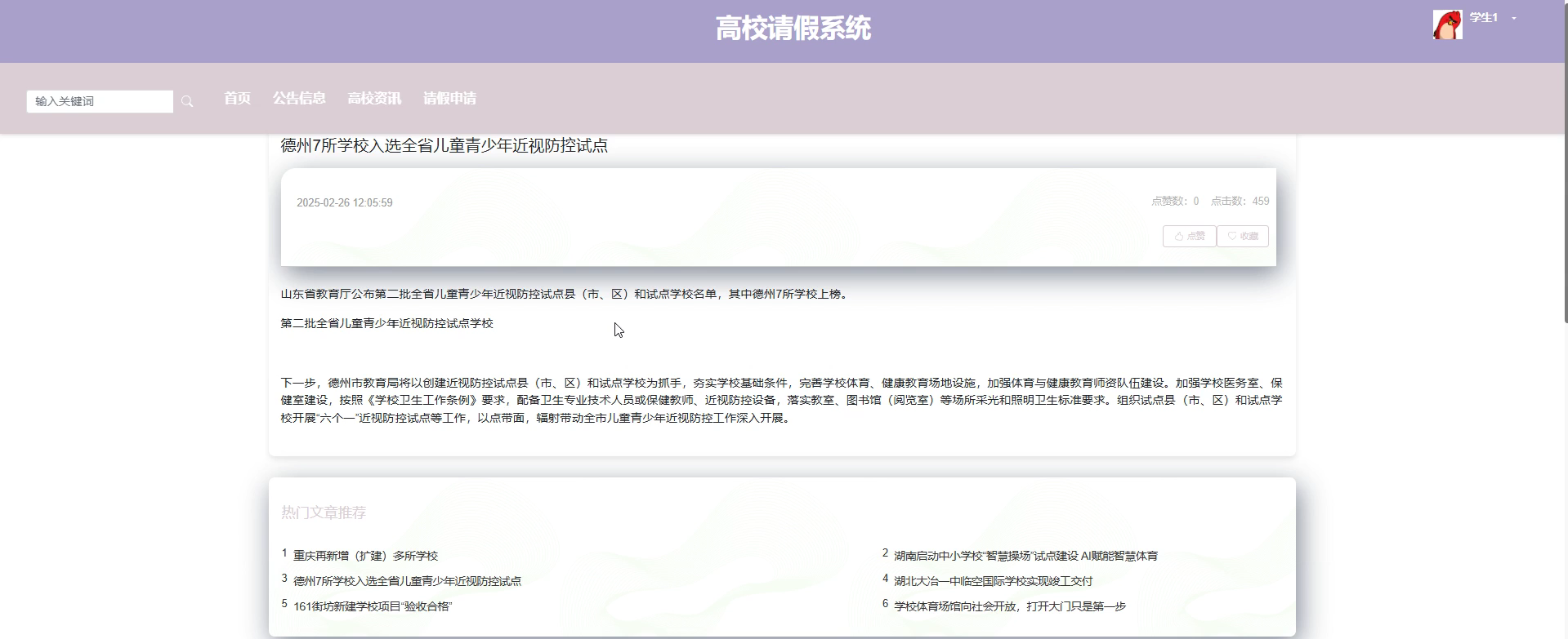 销假申请功能简化了学生的销假流程,只需要在销假界面中输入销假时间、销假备注后提交,等到教师的审核通过。学生可以在线浏览高校资讯,可以点赞和收藏。销假申请如图5-3所示。高校资讯如图5-4所示。