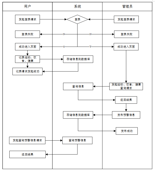 系统操作流程包括以下几个步骤:首先,用户(用户、管理员)通过登录界面输入账号和密码进行身份验证。用户可进入个人主页,进行运动、饮食、健康情况的记录,管理员可以对此类数据进行分析用户的健康状态发送预警信息。系统操作流程如图4-5所示。