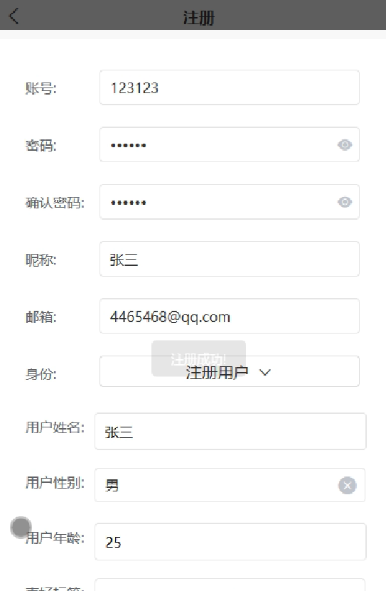 用户注册:输入用户账号、密码、确认密码、用户姓名、性别、身份、年龄、联系方式等信息,用户可以注册,并设置个人密码来保护账户安全,如图5-1所示。