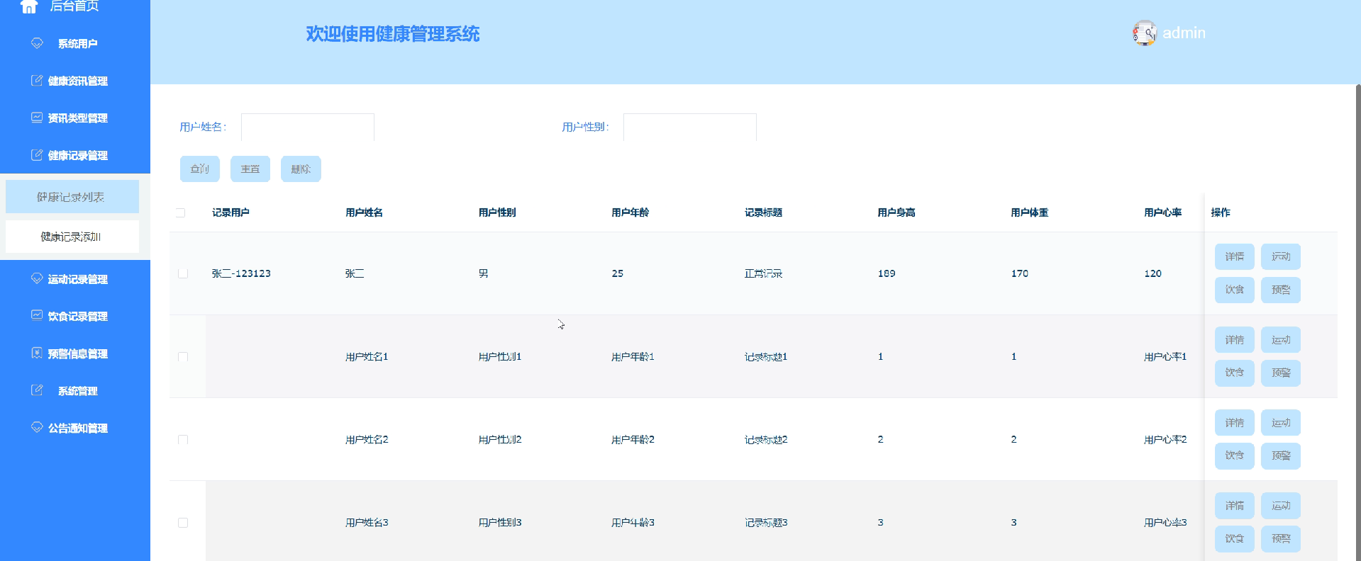健康记录管理:管理员可以随意点击某个用户,具体了解其身体健康指标。