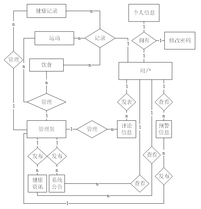 通过建立基于微信小程序的健康管理系统的E-R模型图。以此来设计详细的数据库资料实体,以下为具体图例:
