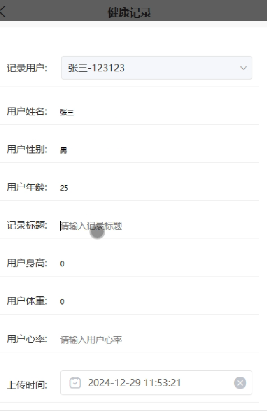 管理员在健康记录管理界面中点击相关选项,即可查看用户上传的个人身体健康数值,如体重、身高、用户心率等关键指标。通过这一功能,管理员能够全面监控用户的健康状态变化,及时发现潜在的健康问题。健康记录管理界面如图5-9所示。