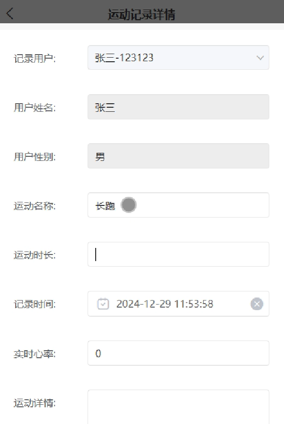 运动记录:允许用户详细记录日常活动和锻炼情况,包括运动强名称、姓名、性别、运动名称、运动时长、实时心率、运动详情等信息。这些数据有助于用户记录运动习惯,激励持续进步。运动记录界面如图5-4所示。