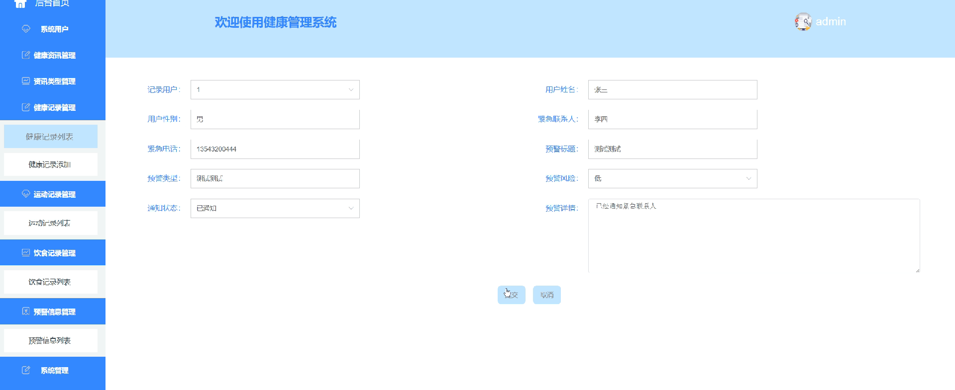 预警信息管理:管理员可以通过此功能向用户发送健康预警信息,这些提醒基于用户的个人健康数据和当前健康趋势。