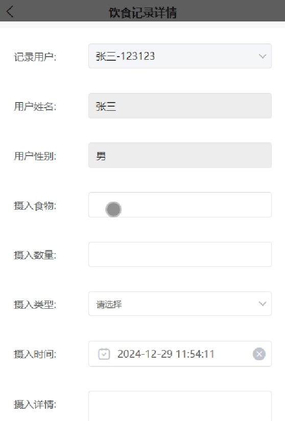 饮食记录:用户能够轻松录入用户姓名、性别、摄入食物、摄入数量、摄入类型、摄入时间以及摄入详情。饮食记录界面如图5-6所示。
