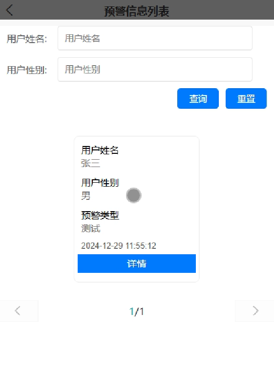 预警信息管理:管理员能够在系统中发布用户的健康预警信息,依据用户上传的健康数据识别潜在风险并及时发出警告。这不仅有助于用户及时关注自身健康问题,还能指导他们采取必要的医疗措施或调整生活方式。预警信息管理界面如图5-12所示。