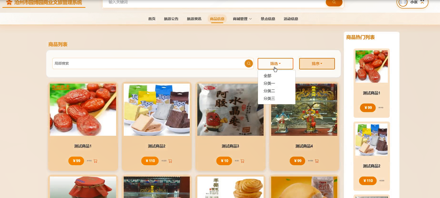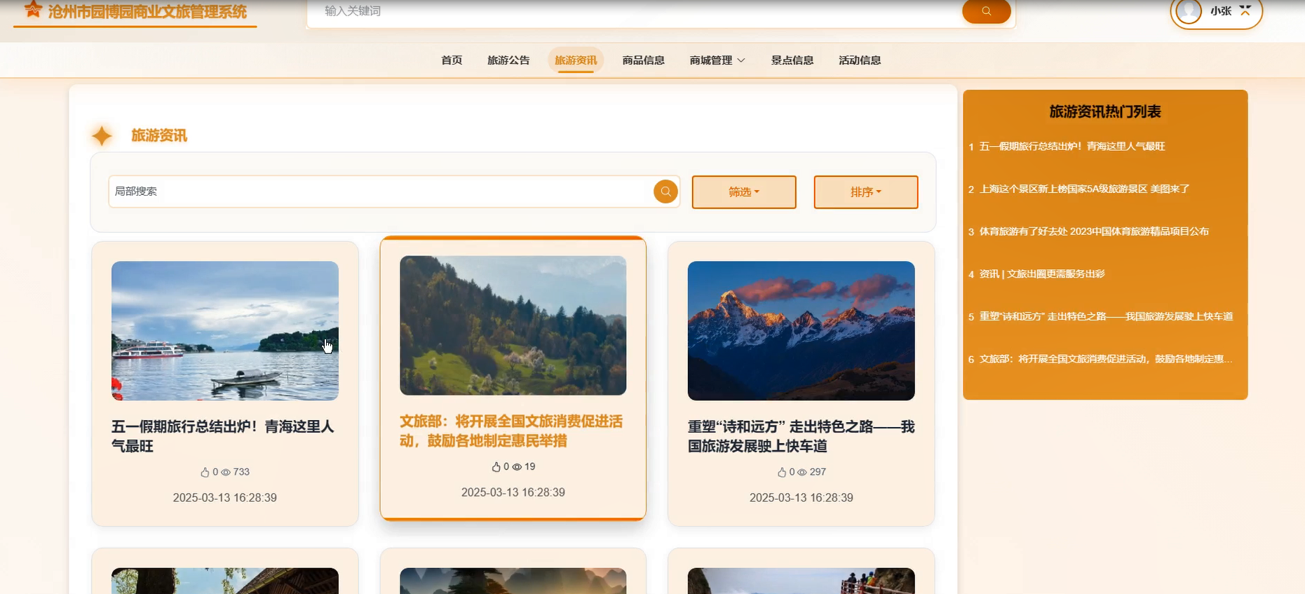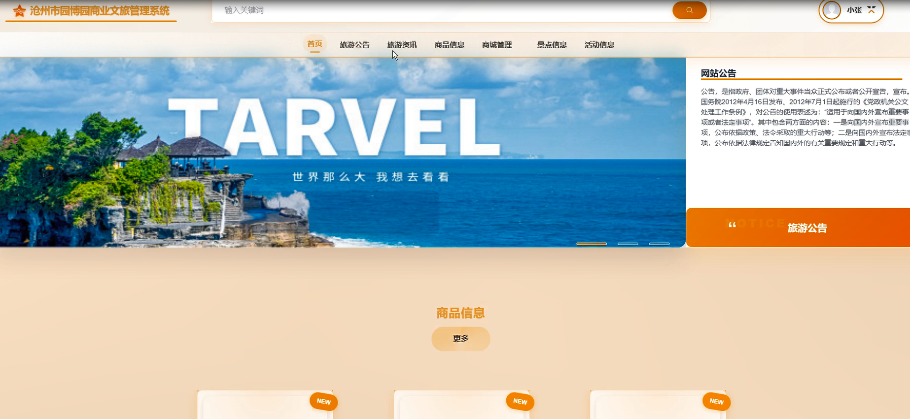 首页:展示热门旅游信息、商品信息及景点信息信息,帮助用户快速了解平台动态。支持搜索和筛选功能,提升用户体验。