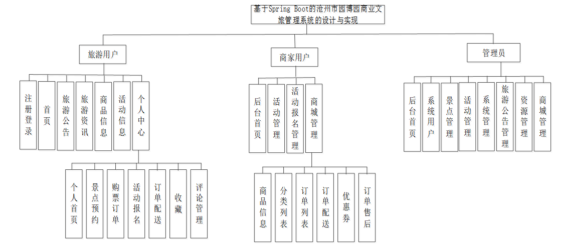 本系统旨在满足旅游用户、商家用户和管理员在沧州市园博园商业文旅管理系统设计需求,通过功能模块化设计实现高效、安全的交易体验,确保平台运营的规范性和便捷性。具体功能描述如下:
