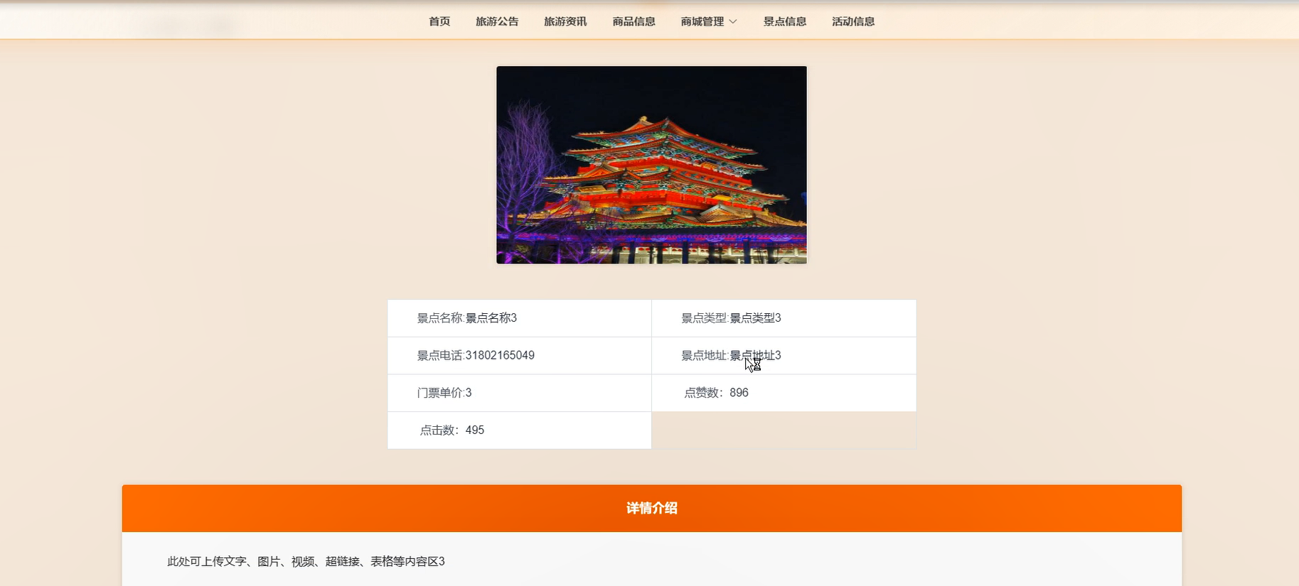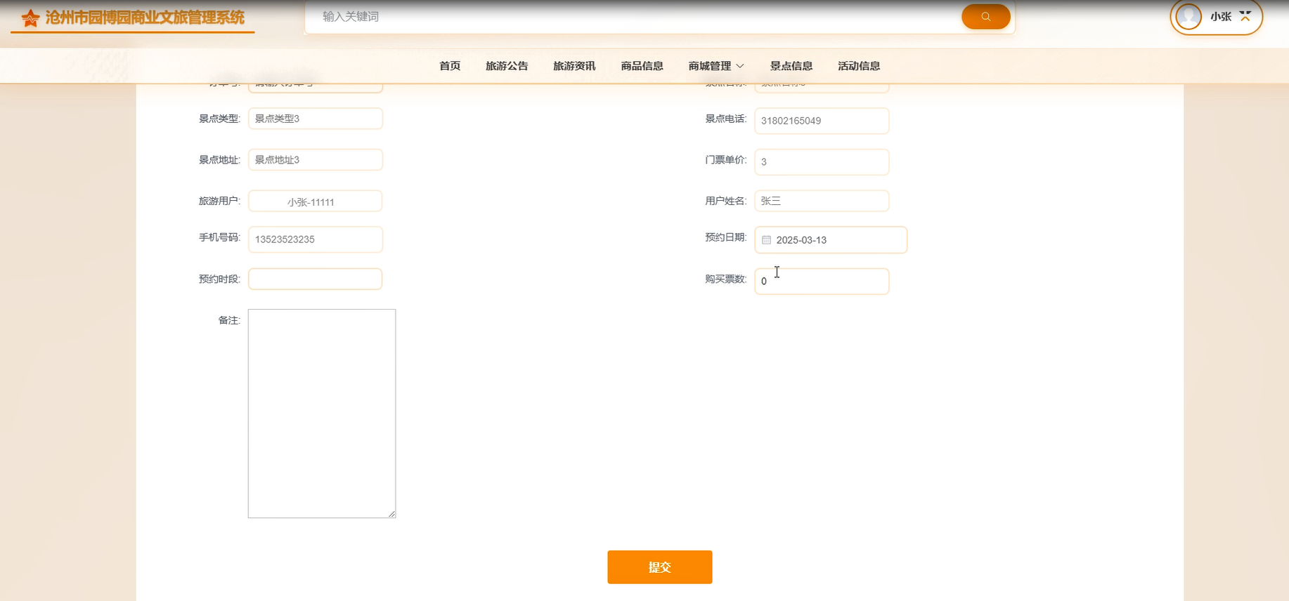 景点信息:用户可以查看景点信息详情,可以进行点赞收藏,也可以进行预约操作,包括预约时间段、预约日期、购买数量等详情。