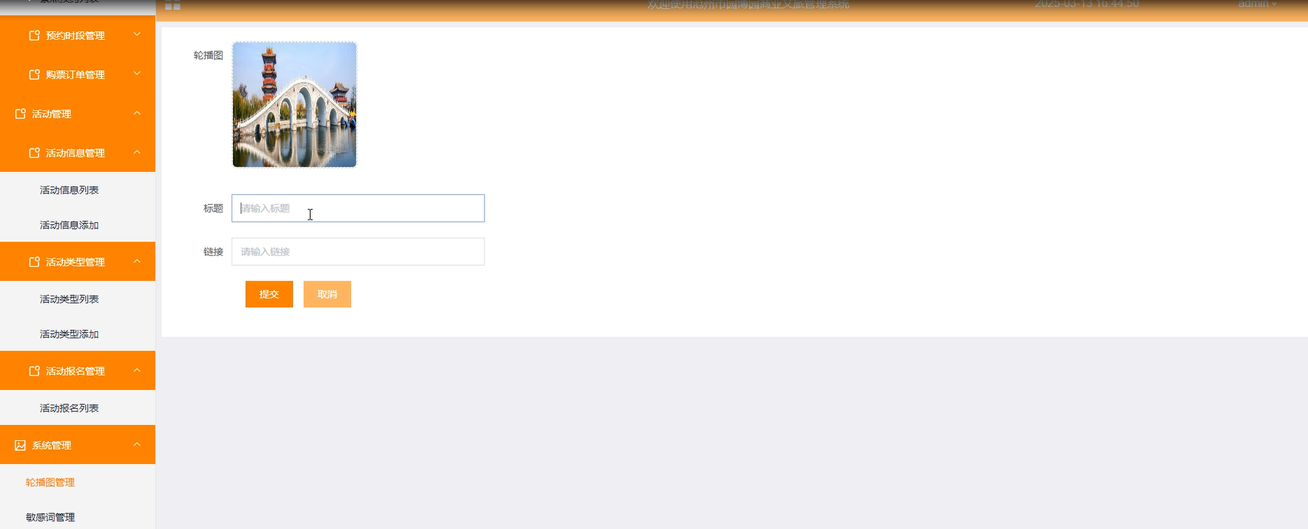 系统管理:管理员配置首页轮播图内容,支持图片上传和链接设置。