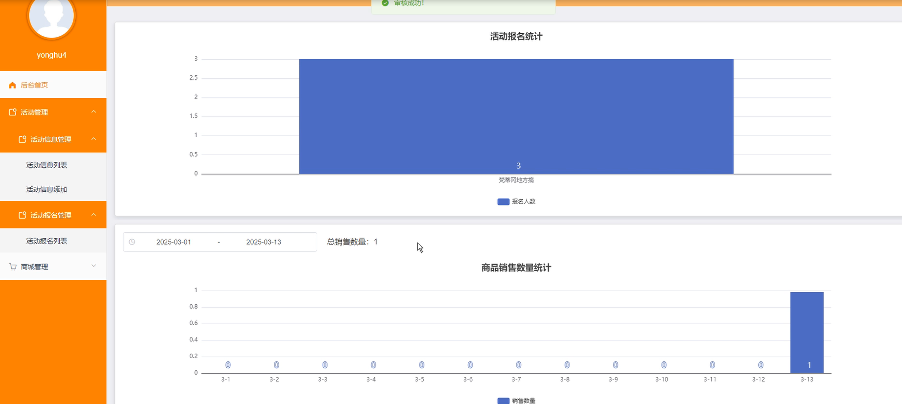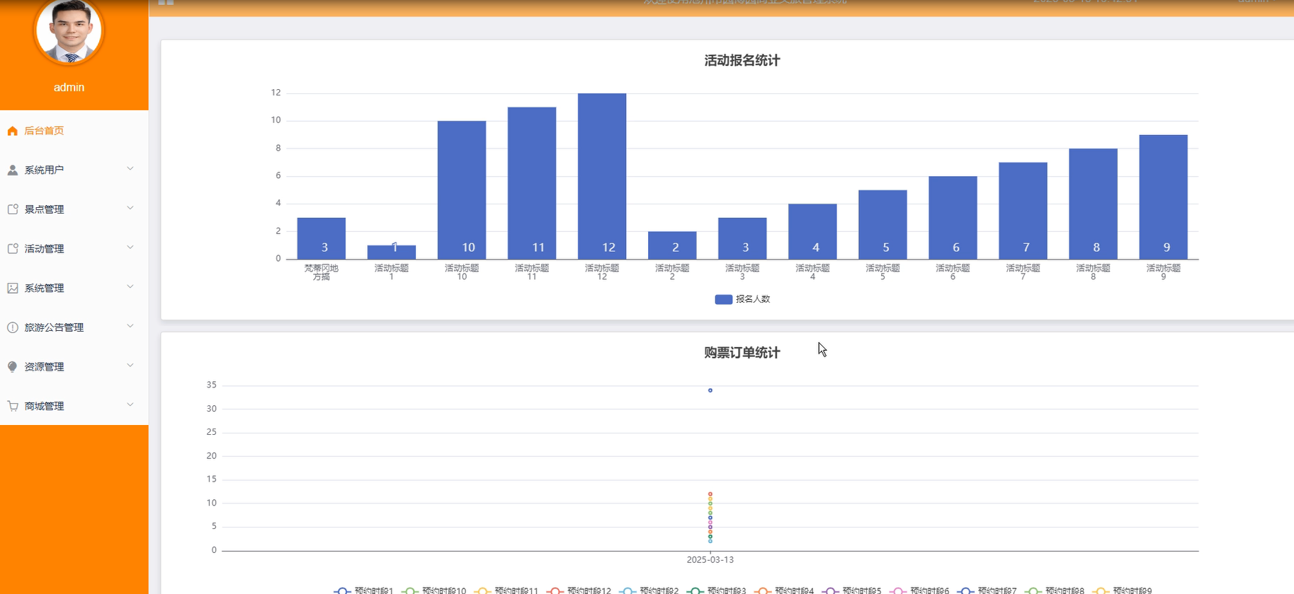 后台首页:展示平台关键数据统计,如活动报名统计、购票订单统计等。支持图表化展示以辅助决策。