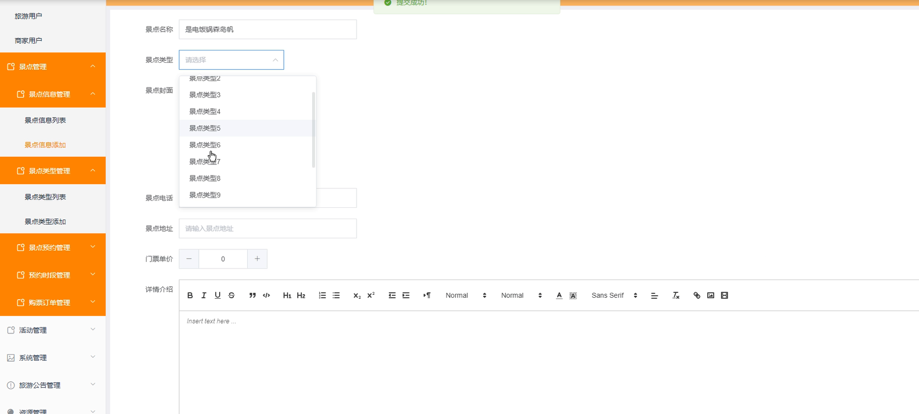景点管理:管理员管理景点信息列表及添加、景点类型添加、及景点预约、购票订单的管理,可以进行增删改查的操作。