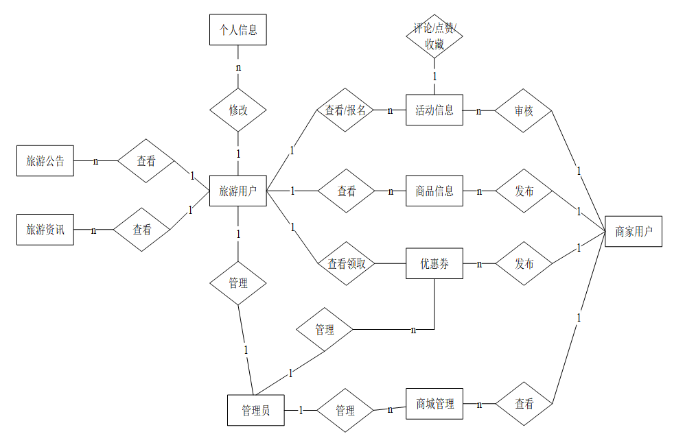 本文在系统分析阶段就抽取了一些实体,根据实体之间的关系,经过分析进行系统E-R图的设计。沧州市园博园商业文旅管理系统的总体E-R图如下图所示。