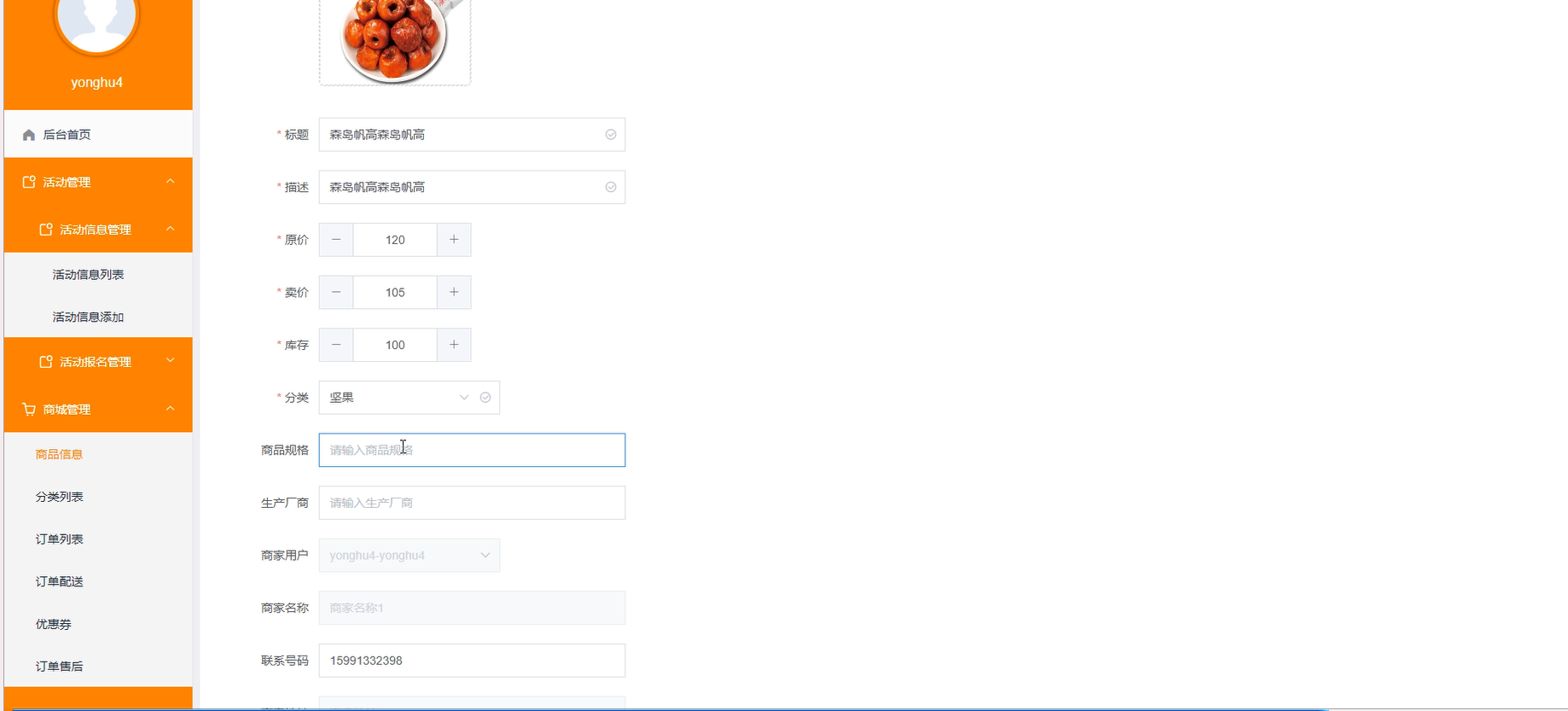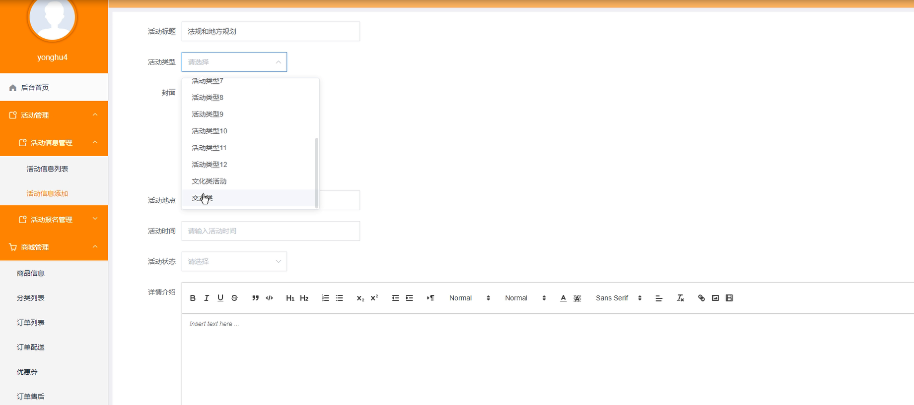 活动管理:商家用户可以管理查看活动信息列表及添加活动详情。