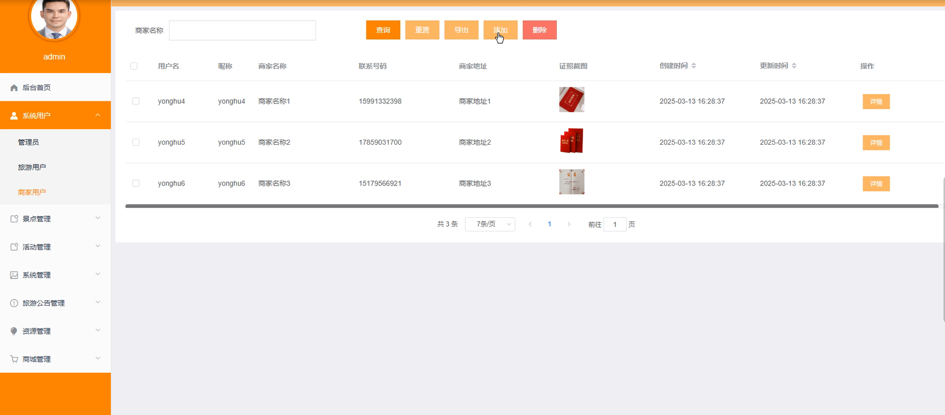 系统用户:添加、删除或修改旅游用户和管理员信息,支持批量操作和权限调整。