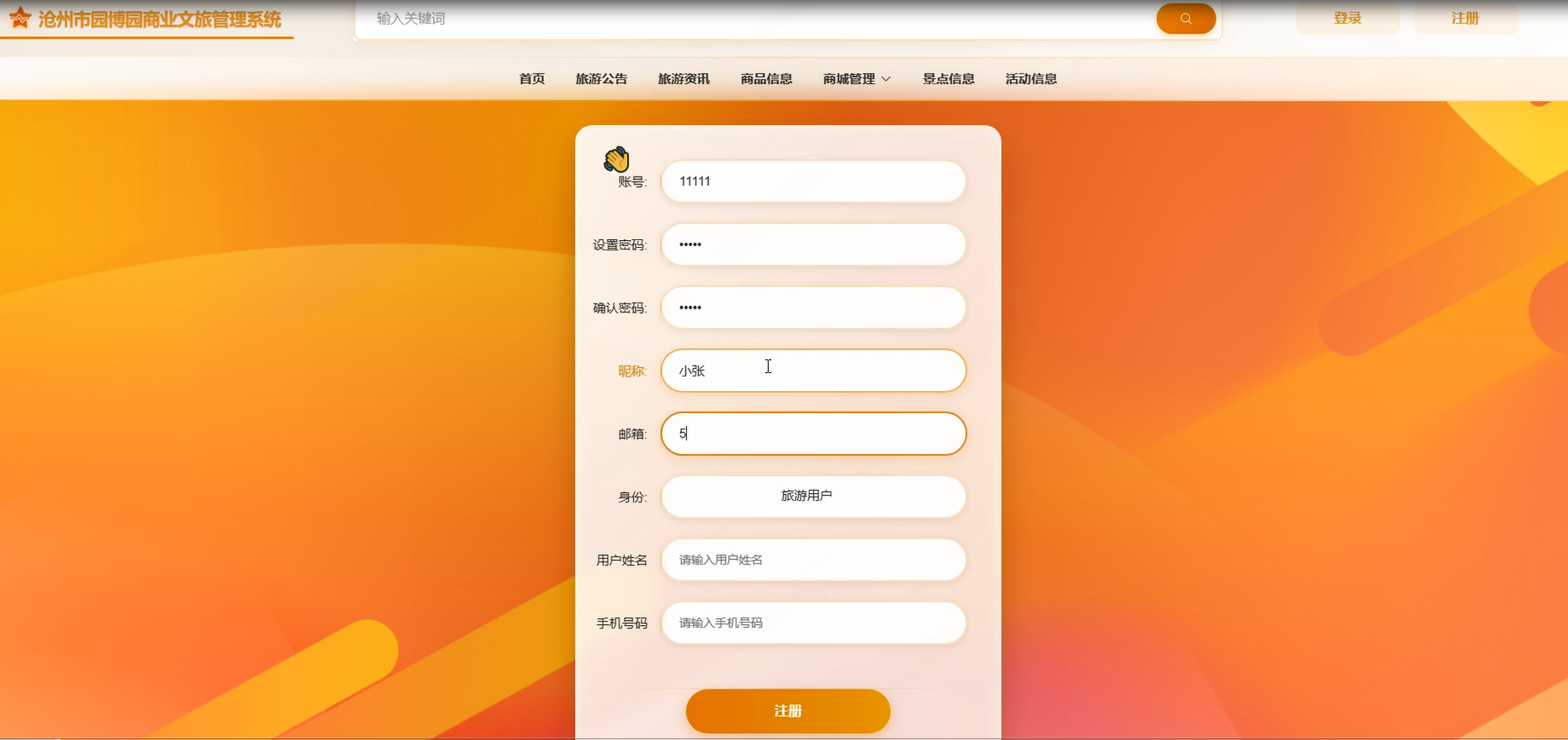 注册登录:旅游用户需要浏览旅游信息需要注册账号密码,包括设置账号、密码、昵称、邮箱等信息,注册完成后通过后台管理员审核通过后方可进行登录。