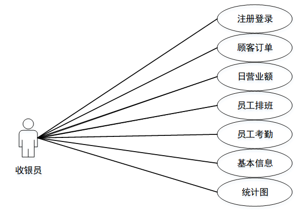 收银员登录后,可以点击查看顾客订单中查看服务员录入的订单信息;统计餐厅的日营业额数据;查看个人的排班之外还可以查看个人的考勤明细。收银员用例图如图3-3所示。