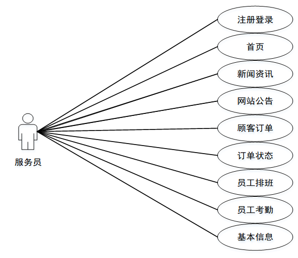 服务员先在APP端进行登录;在首页界面可以浏览各种功能模块;点击新闻资讯查看最新的资讯文章,可以点赞和收藏;查看网站公告,了解最新的公告内容,点击顾客订单可以对餐厅的客户订单进行录入,有客户信息、菜品分类、菜品价格、菜品数量、菜品总计以及菜品备注等;跟进菜品出单进度和状态;可以再员工排班模块中查看个人的具体排班安排;点击员工考勤可以了解个人的日常考勤明细。服务员用例图如图3-1所示。