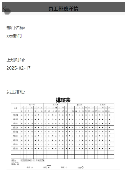 员工排班统一由后台端的管理员进行制定和发布,小程序端的服务员、厨师以及收银员都可以通过各自界面中的“员工排班”模块,进行个人排班详情的查看。