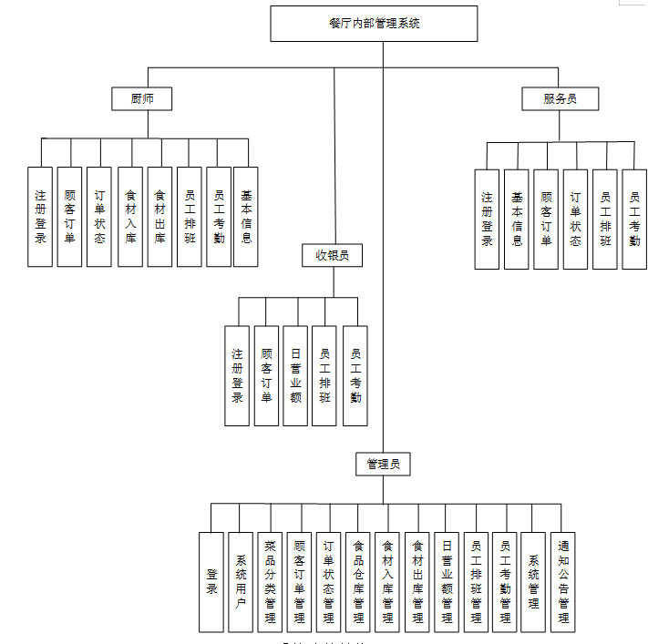 通过调研和分析,该系统的功能设计为注册登录、新闻资讯、顾客订单、食品仓库、食材入库、食材出库、员工排班、员工考勤管理等功能。