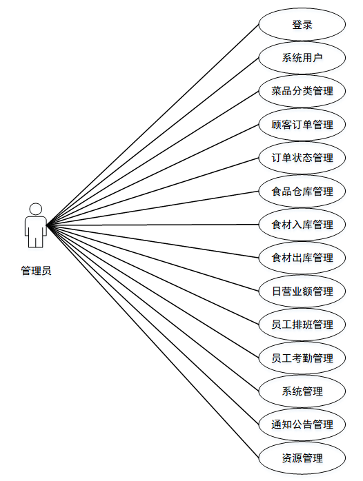 管理员登录后,可以对菜品信息进行分类管理,便于服务员进行搜索查找;查看顾客的菜品订单信息;跟进订单的进度状态;对食品仓库进行维护管理;查看以及审核食材的入库以及出库;查看餐厅的日营业额数据;发布员工排班信息以及记录员工的考勤;负责轮播图更换、通知公告和新闻资讯内容的发布管理。管理员用例图如图3-4所示。