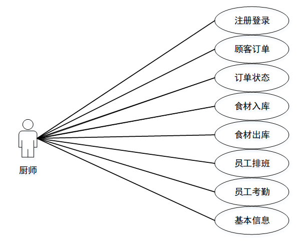 厨师用户登录后,可以点击查看顾客订单中查看服务员录入的菜品信息进行菜品的准备;对订单状态进行更新;厨师负责食材入库以及出库记录的操作,操作完成将会相应减少或者增加食材库存,食材低于10将会收到系统提醒;点击查看厨师的排班信息以及可以查看个人的日常考勤信息。厨师用例图如图3-2所示。