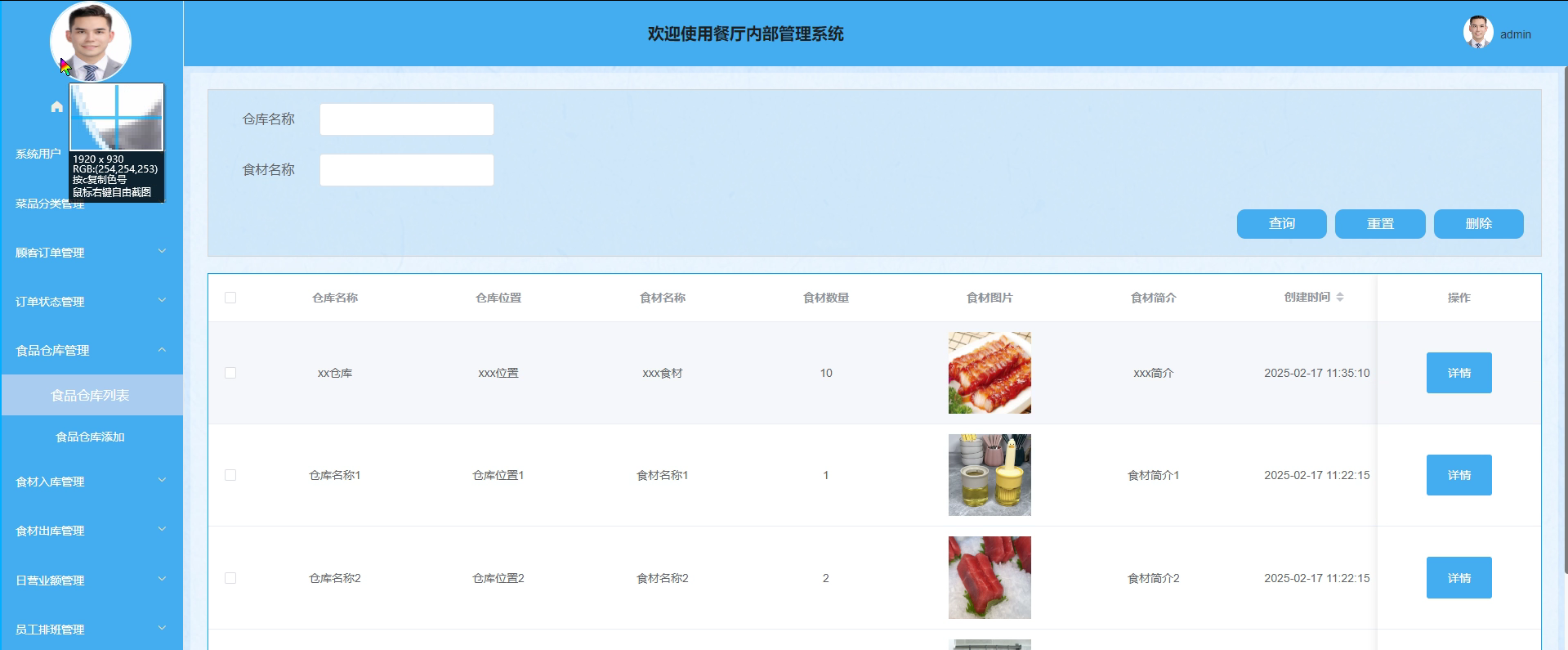 管理员点击食品仓库界面后,可以对餐厅的所有食品库存进行高效管理。支持批量操作和设置库存预警,管理员可以快速执行食材补充或调整订单,避免食材短缺或过剩。