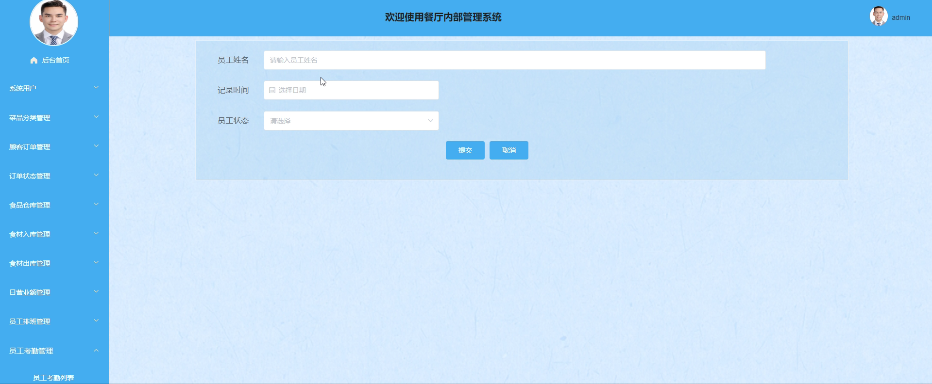管理员可以对员工考勤内容进行添加、修改以及删除操作,负责对员工的日常考勤进行记录管理。