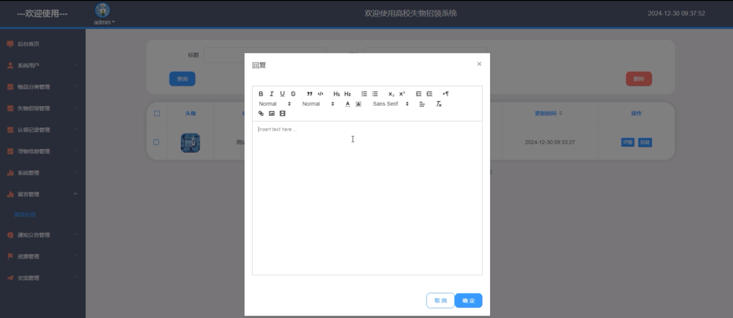 失物招领管理:管理员可以对失物招领信息进行管理,通过物品名称或分类进行查询,对信息进行删除、查看用户评论等操作。