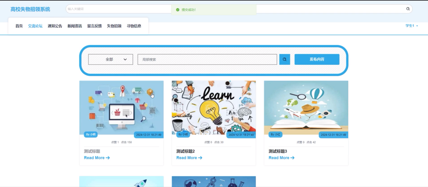 首页:首页是学生用户进入平台后看到的第一个界面,提供快速入口和导航到其他功能模块,如交流论坛、新闻资讯等。同时,首页可能会展示最新或热门的帖子、新闻和失物招领信息,方便用户浏览。
