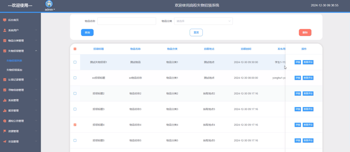 管理员可以对寻物信息进行管理,通过物品名称或分类进行查询、删除、查看用户评论等操作,帮助用户快速找到丢失物品。界面如下图所示。